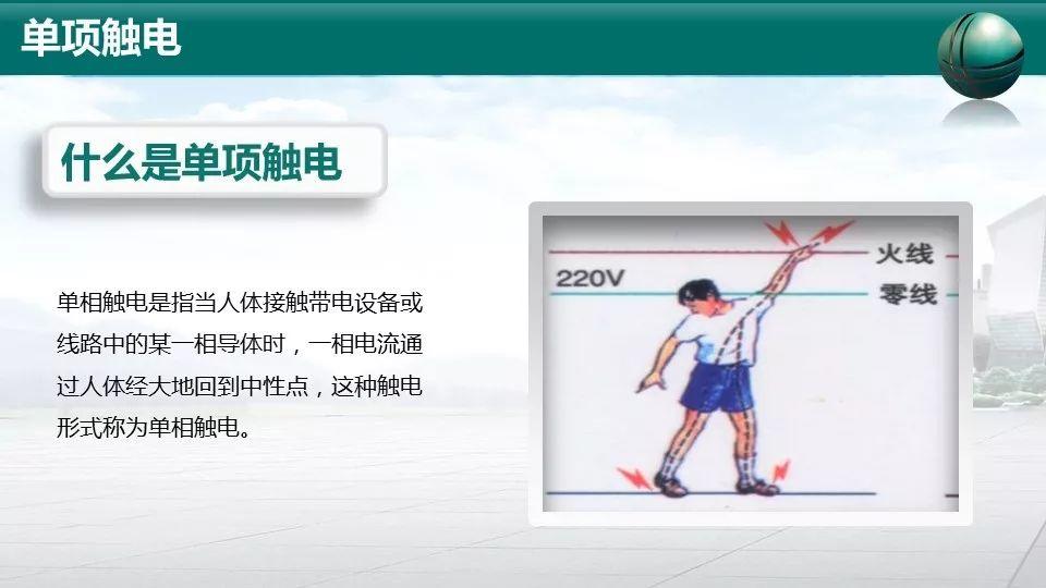 单相触电是指当人站在地面上人体的某一部位触到某相火线而发生的触电现象。在低压供电系统中发生单相触电,人体所承受的电压几乎就是电源的相电压220V。